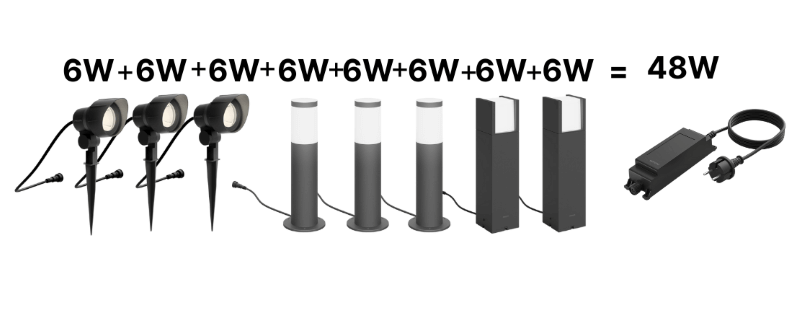 - Oczywiście, potrzebny będzie również zasilacz (transformator). Jest on dostępny w maksymalnej mocy 48 W. Sumując moc poszczególnych lamp, nie należy przekraczać tej wartości. Jeśli potrzebujesz oświetlić większy obszar większą liczbą lamp, musisz również zakupić kilka zasilaczy.
